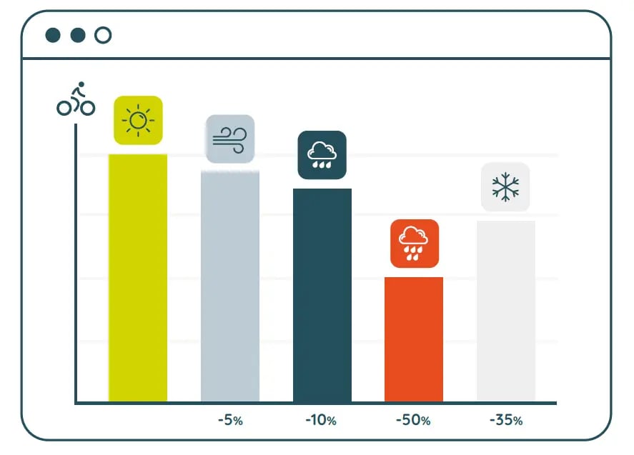 A chuva, o vento ou o frio geralmente são vistos como grandes obstáculos para andar de bicicleta ou a pé. Ao integrar dados meteorológicos diretamente na plataforma, é possível medir o impacto real sobre o número de visitantes e tomar as decisões corretas de planejamento e comunicação, sem superestimar ou subestimar o impacto do clima.